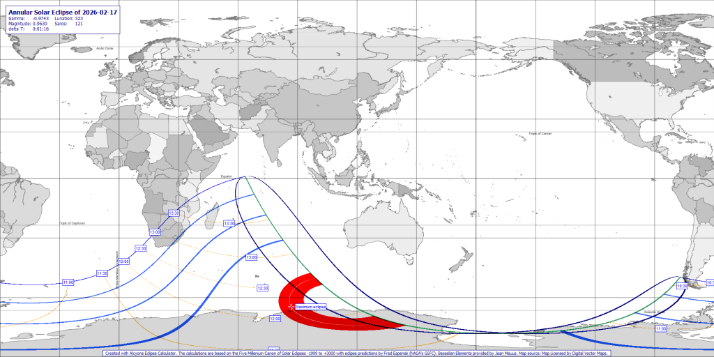 Annular eclipse of the Sun on February 17, mostly over Antartica.