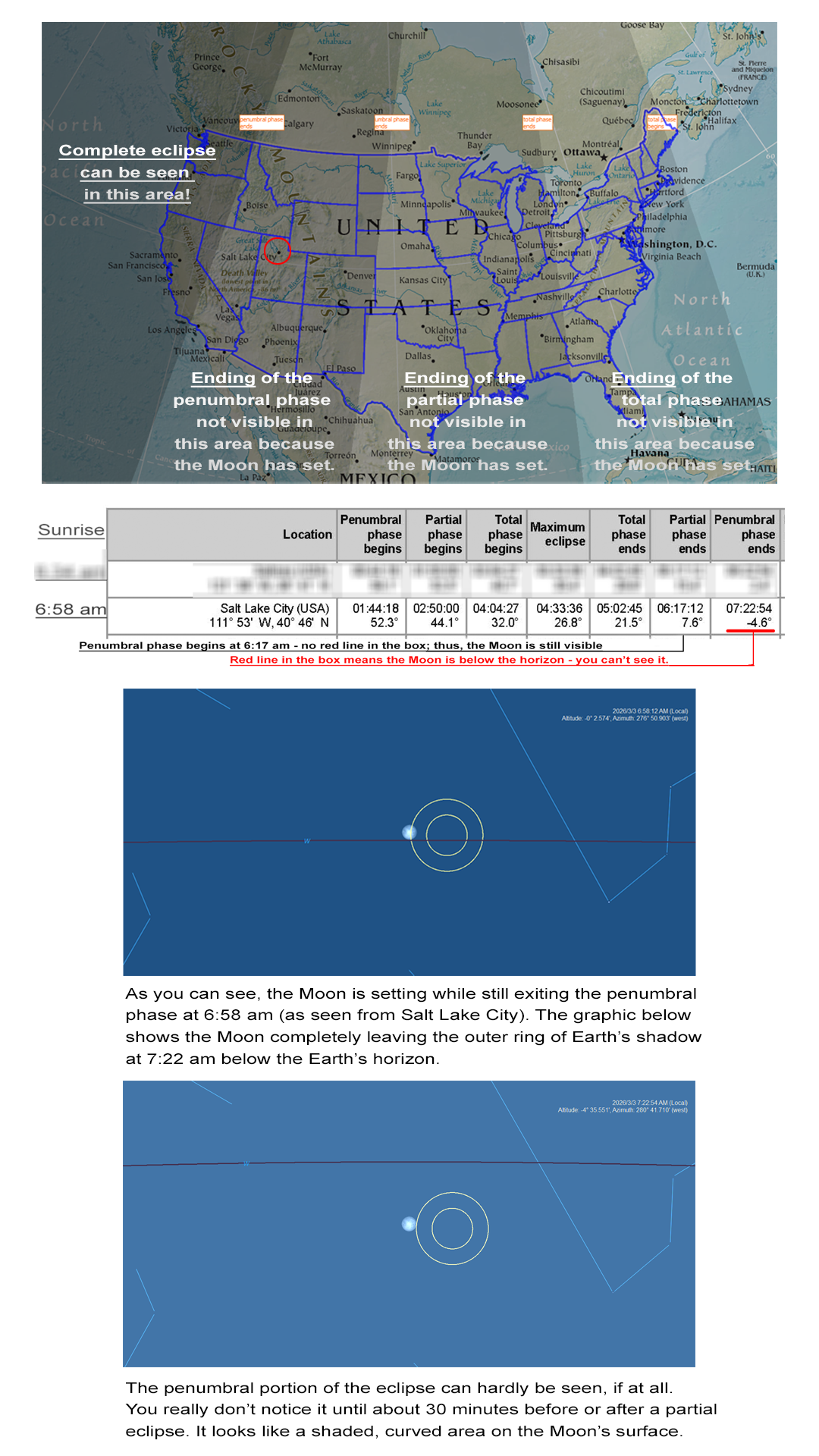 The seven pages above list 300 cities, showing sunrise times for each town and the conditions seen at each location. For example, in Salt Lake City, you can see the complete, partial, and total phases of the lunar eclipse. The only thing you won’t be able to see is the Moon completely exiting the penumbral phase because the Moon will be below the horizon. (See below)
